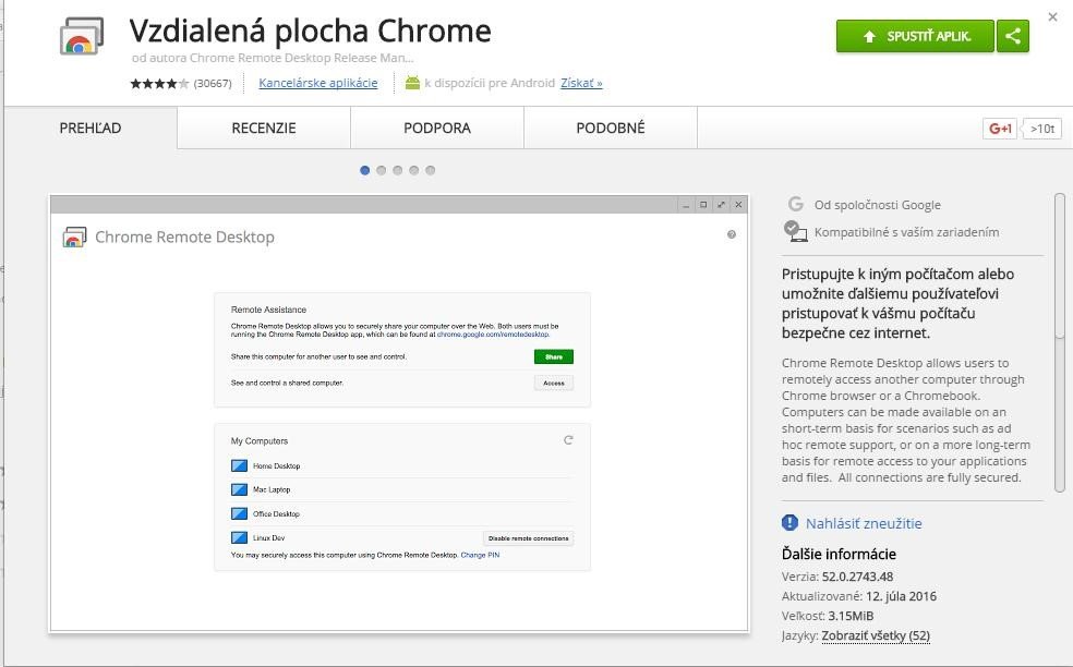 Aj keď existuje viacero programov na zdieľanie obrazovky na diaľku, veľký pán Google nám chce, ako vždy, zjednodušiť život a vyšiel nám v ústrety vytvorením nového rozšírenia pre prehliadač Google Chrome. Stačí si v Google obchode prevziať a nainštalovať aplikáciu Vzdialená plocha chrome – Chrome Remote Desktop.